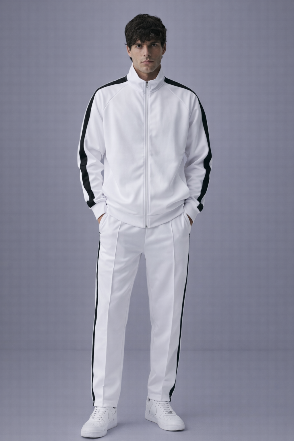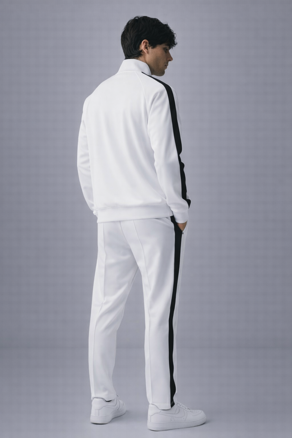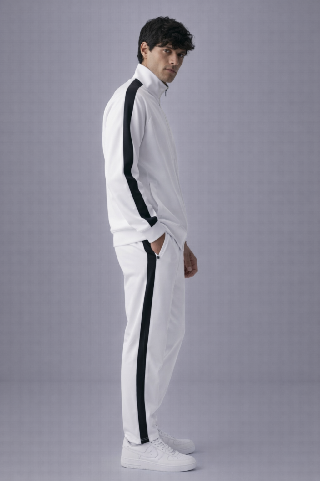 This white panel tracksuit has a clean athletic look with smooth fabric and sharp black side stripes. The jacket comes with a full zip and a stand collar for a sporty feel, while the matching pants keep a straight, comfortable fit. It’s an easy option for training, casual wear, or a fresh everyday style.