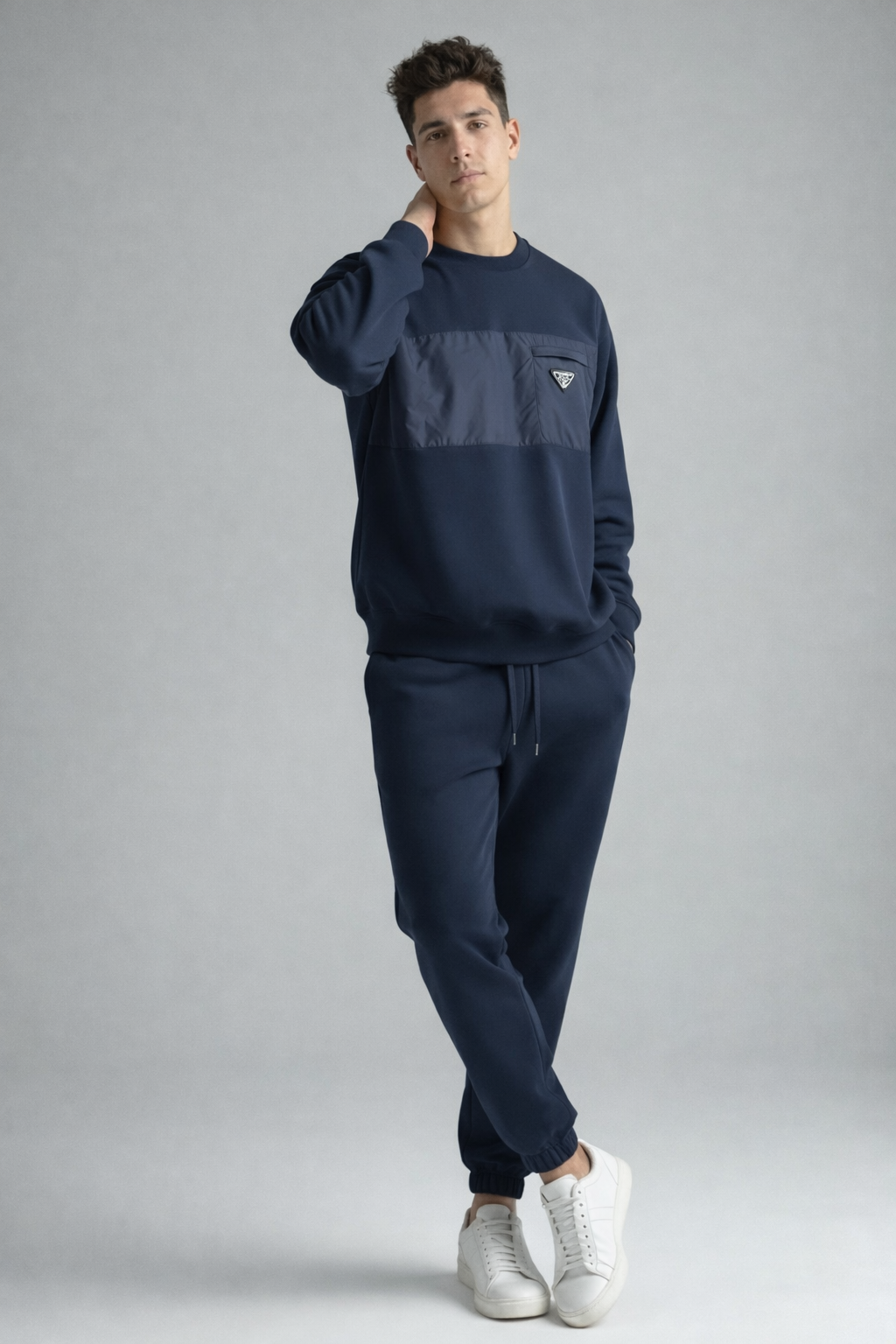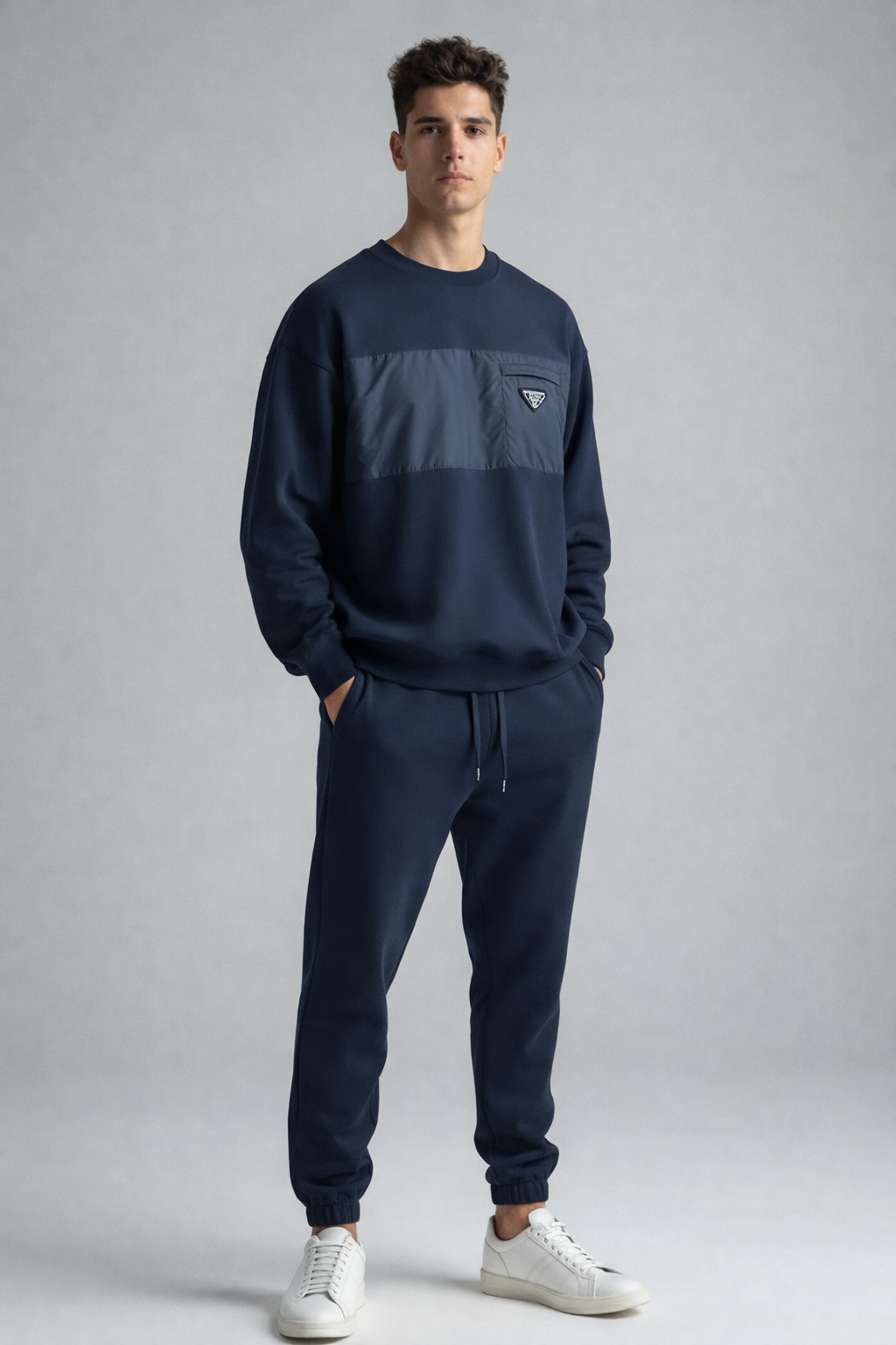 This navy co-ord set blends sporty comfort with a premium streetwear look. The sweatshirt features a nylon panel with a zip pocket detail, adding a sleek contrast to its smooth cotton-blend fabric. Paired with matching joggers, it’s the perfect mix of relaxed and refined—ideal for travel, workouts, or casual days out.