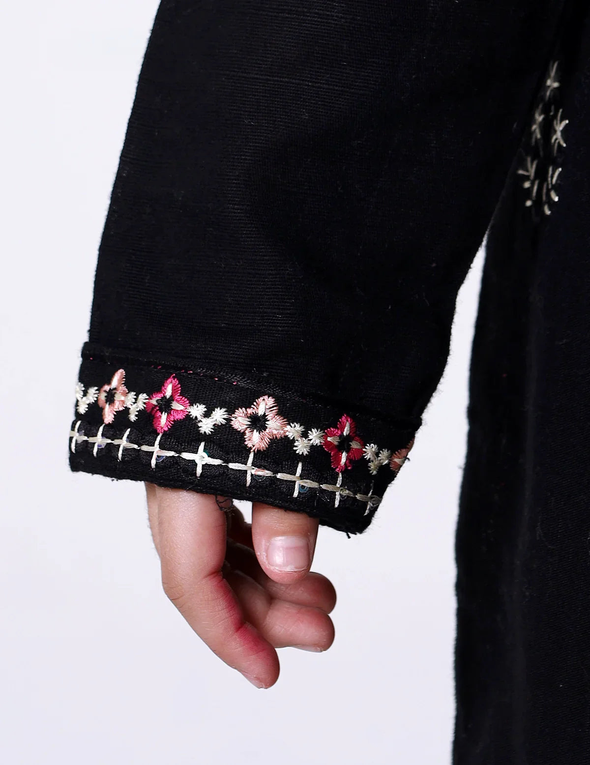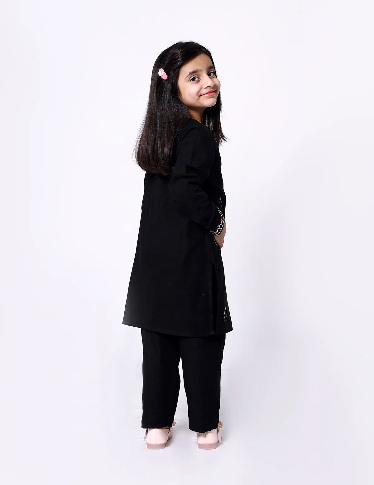 Elevate your girl’s winter wardrobe with this Black Khadar Embroidered Suit. Crafted from soft and warm khadar fabric, it features elegant embroidery, making it perfect for special occasions and casual outings.