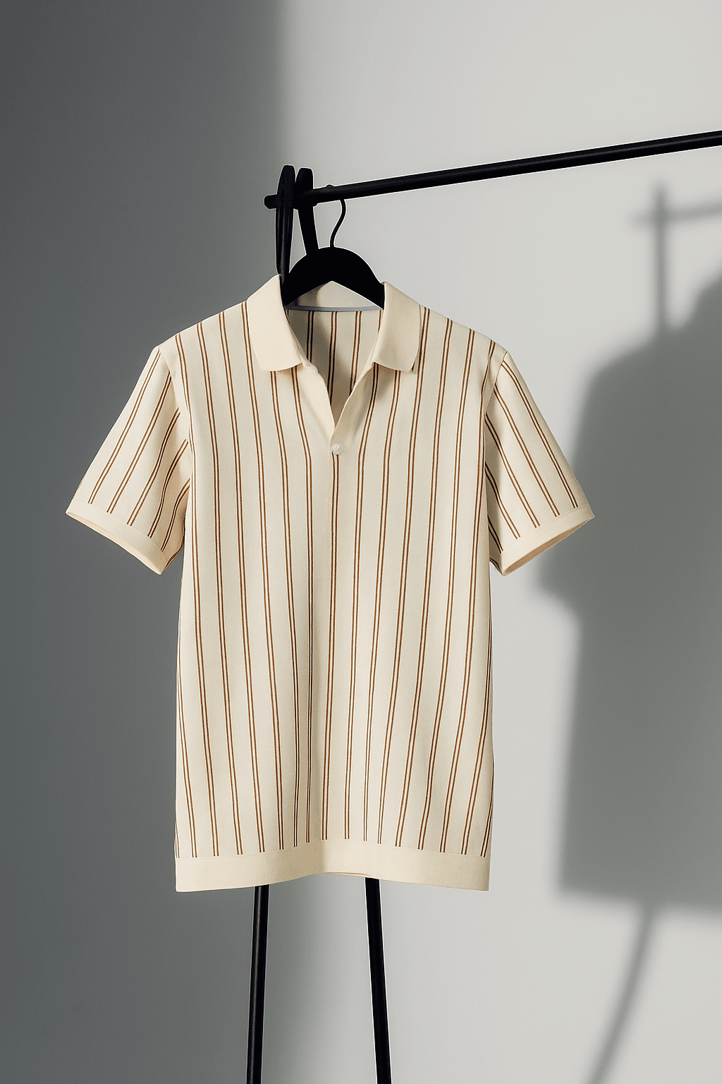 This cream and red vertical striped short-sleeve polo offers a clean, modern look with a touch of retro charm. The lightweight fabric and classic collar make it perfect for casual outings and warm-weather wear.