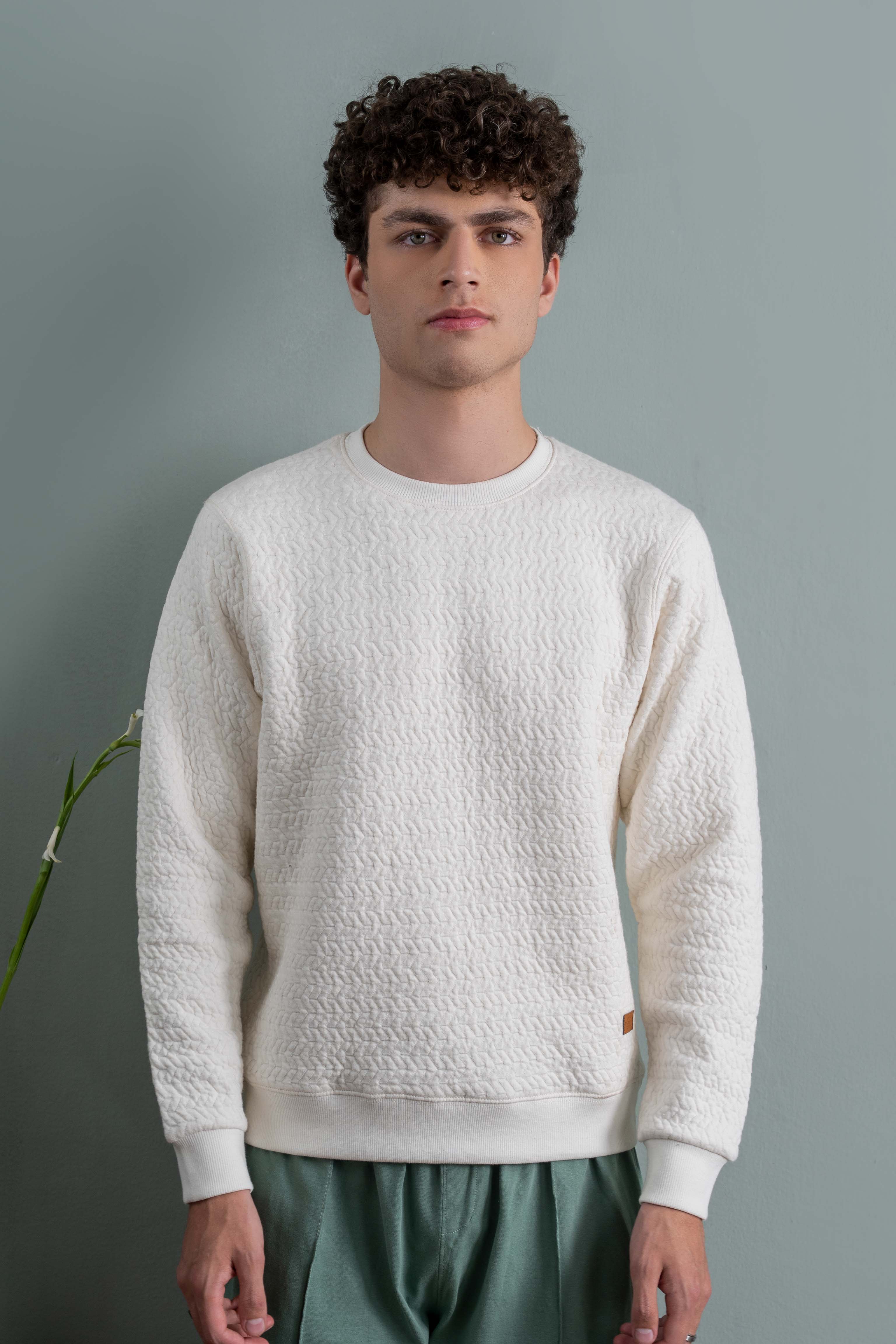 A clean ivory sweatshirt designed with a detailed textured knit surface that gives it a premium feel and standout look. It’s soft, warm and perfect for everyday wear while maintaining a smart and modern profile. The ribbed cuffs and hem keep the fit structured, and the minimal aesthetic makes it easy to pair with any outfit whether casual or styled up.