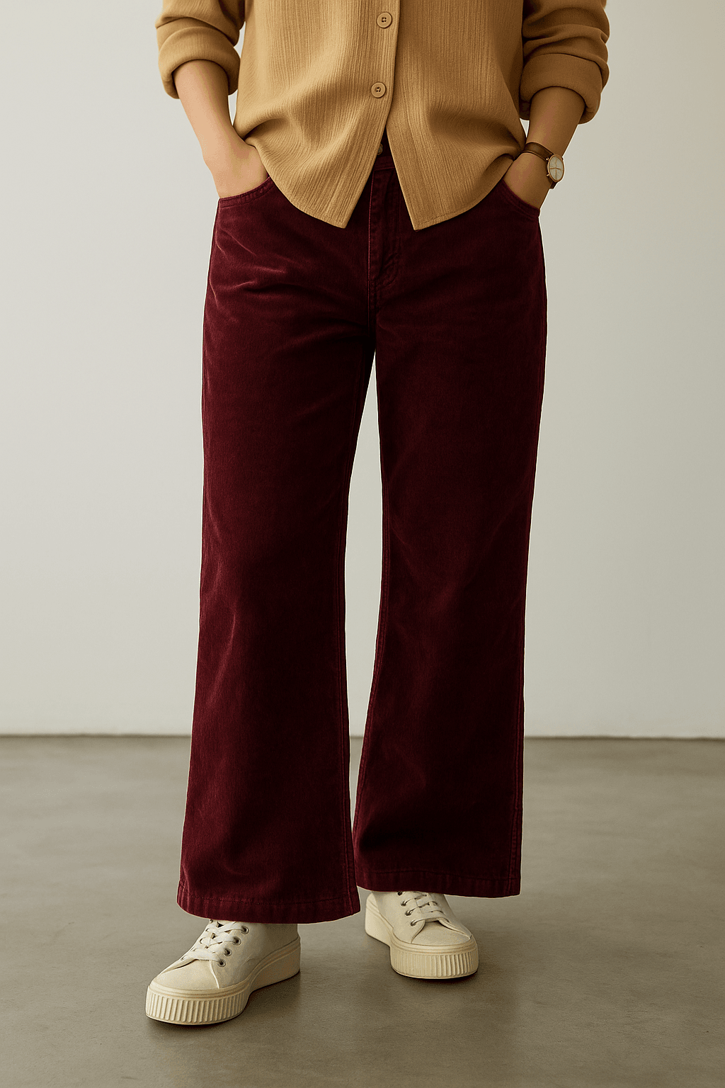Made from soft corduroy, these maroon wide-leg pants bring a rich pop of color to your wardrobe. The high-waist fit ensures comfort and structure, while the wide-leg cut offers relaxed movement. With ribbed texture and neat stitching, they combine durability with effortless style. Perfect to pair with shirts, sweaters, or blouses for versatile looks.