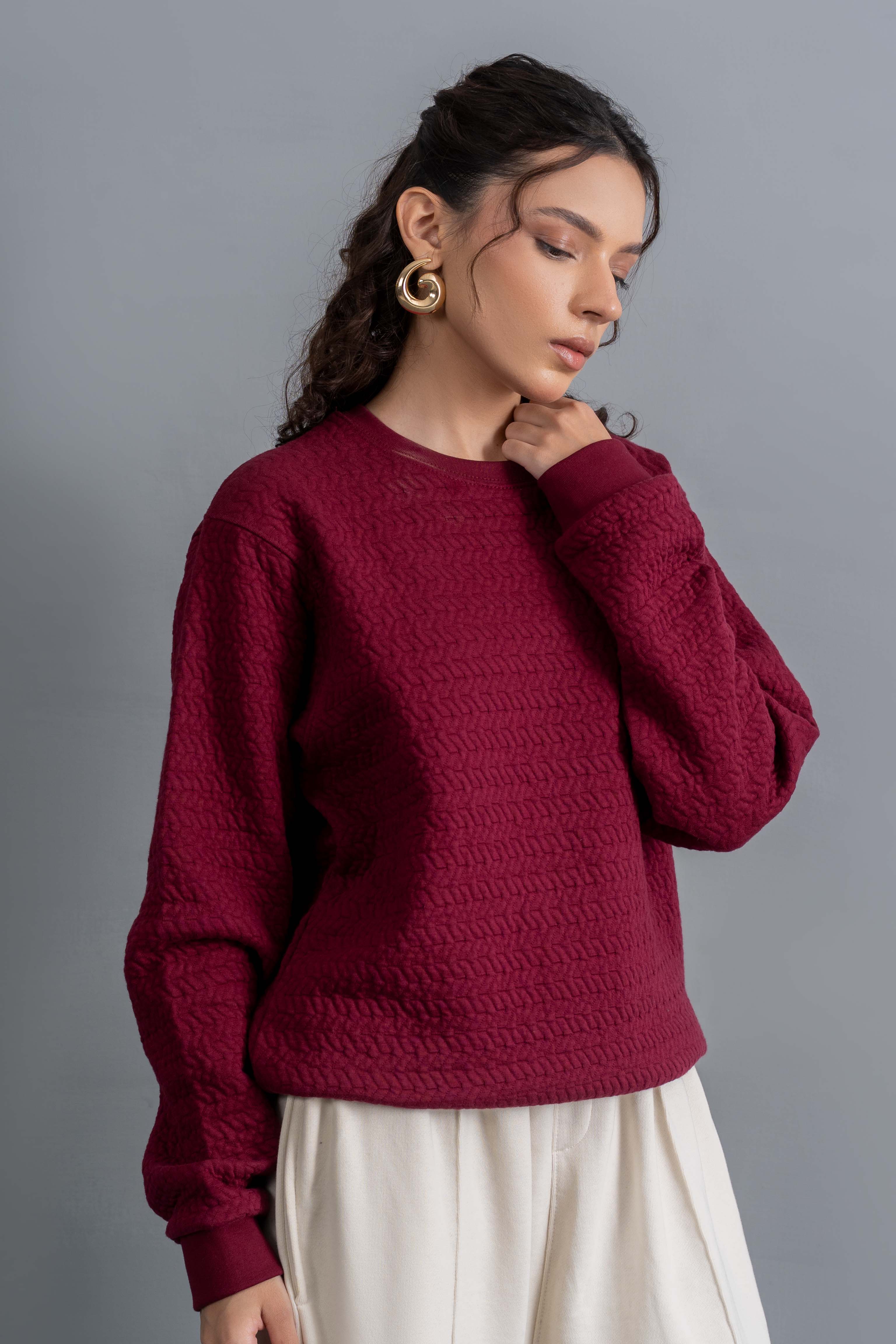A rich maroon textured sweatshirt designed for warmth and everyday style. The woven pattern adds depth while the Adidas branding keeps it sporty and premium. Soft on skin, easy to pair and perfect for winter layering without feeling heavy.