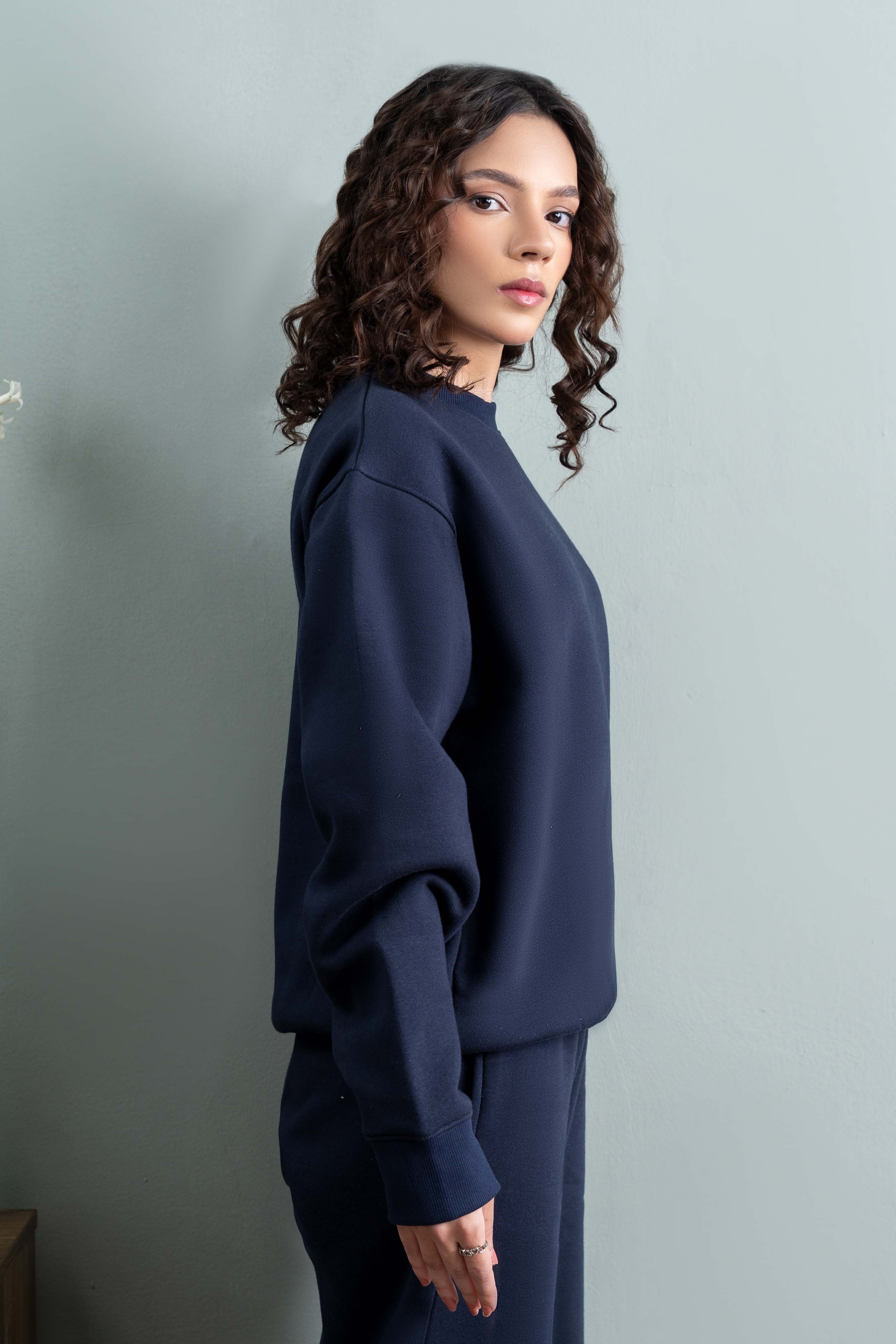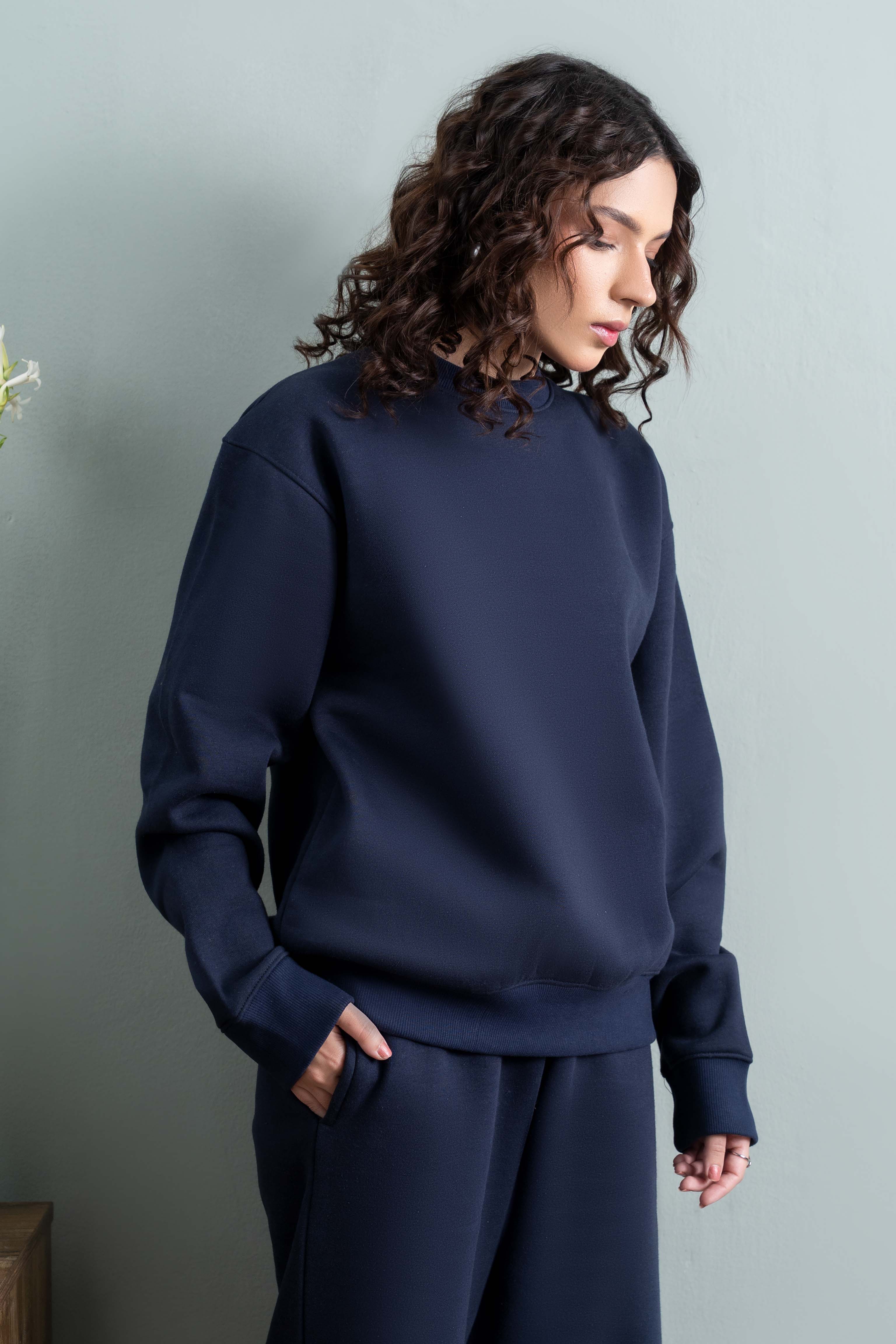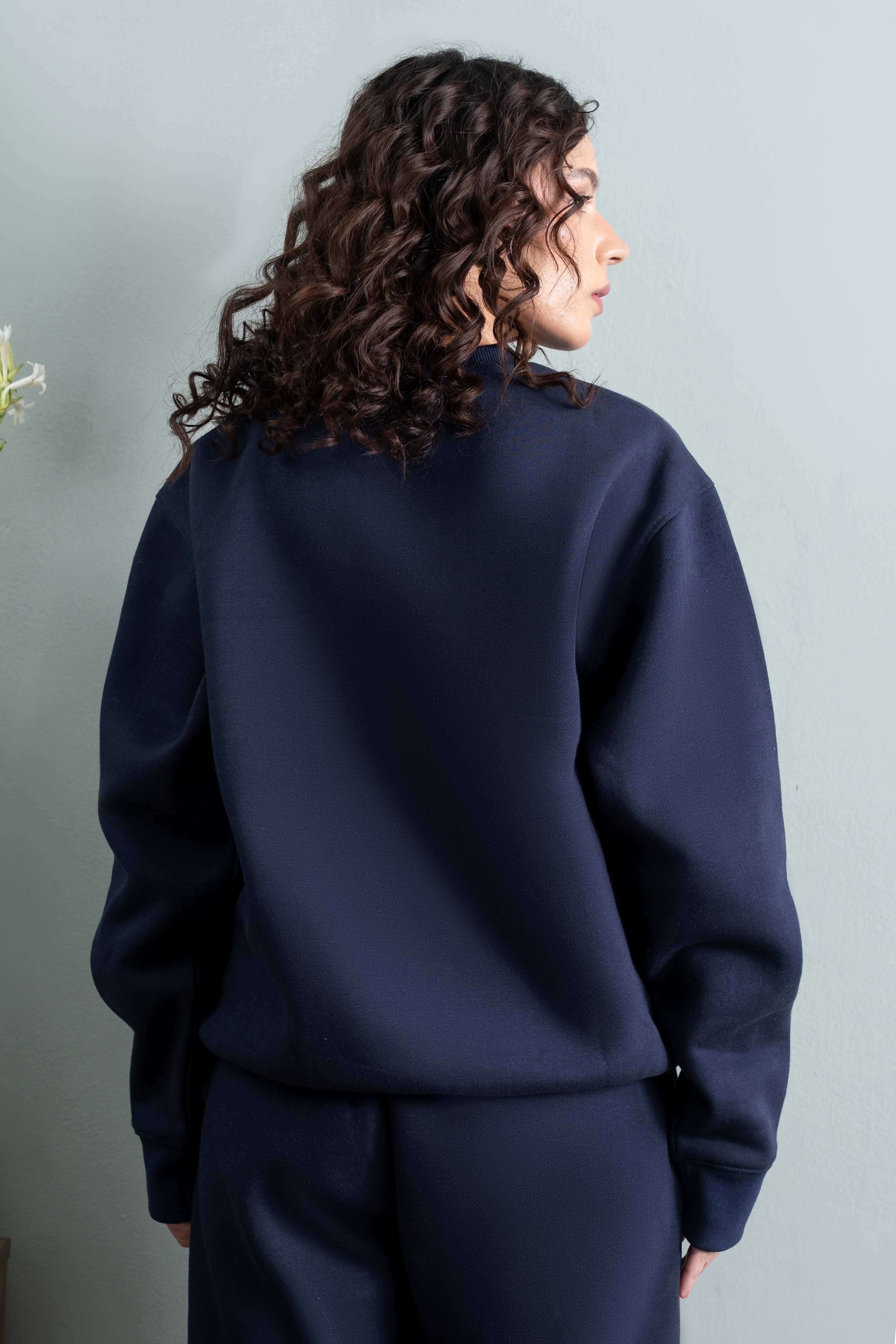 This navy sweatshirt has a clean, minimal look with a relaxed fit that feels easy to wear. The soft fabric keeps you warm without feeling heavy, making it a good pick for everyday use. The ribbed cuffs and hem help it sit neatly while the simple design gives it a neat finish. You can pair it with matching trousers or wear it on its own for a comfortable casual outfit.