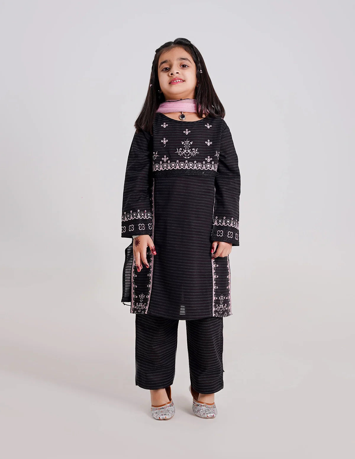 This elegant Embroidered Black & Pink Trouser Set is perfect for festive occasions and formal gatherings. The finely detailed embroidery on the black kurti, paired with matching trousers and a soft pink dupatta, adds a touch of sophistication. Made from breathable fabric, this outfit ensures both comfort and style for your little one.