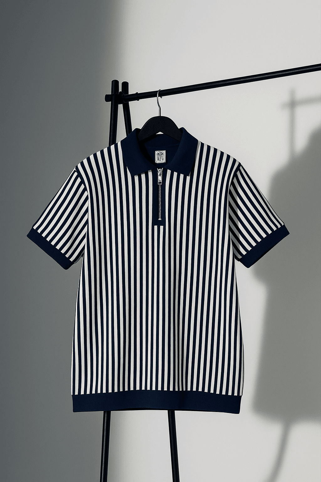 This navy blue and white vertical striped knit half-zip polo offers a crisp, modern look with a timeless pattern. Crafted from breathable knit fabric, it’s perfect for versatile, all-day wear.
