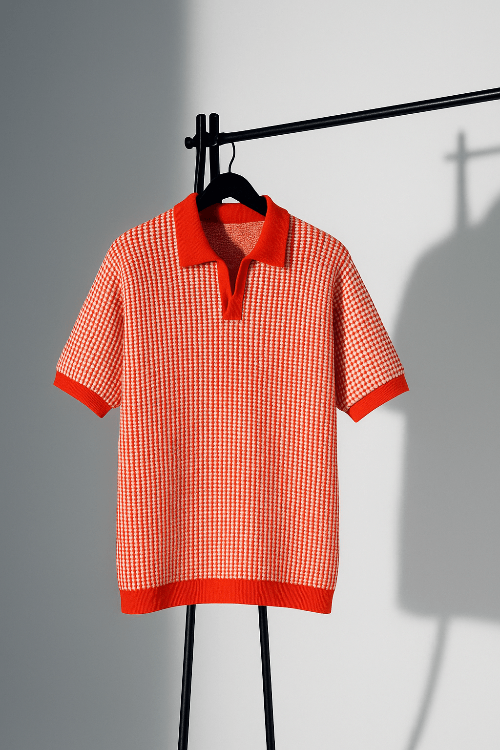 This red and white textured knit half-zip polo delivers a vibrant, eye-catching look perfect for sunny days. Crafted from breathable fabric, it offers both comfort and standout style.