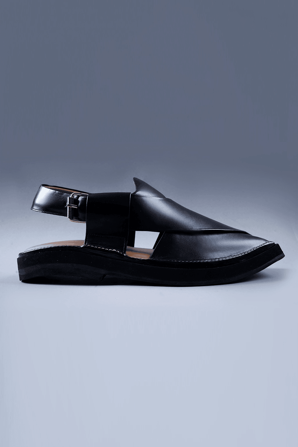 This jet black Kaptaan chappal combines bold elegance with traditional craftsmanship. Its glossy finish and square toe silhouette offer a sharp look suited for formal and festive occasions.
