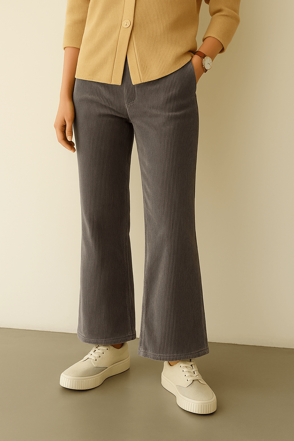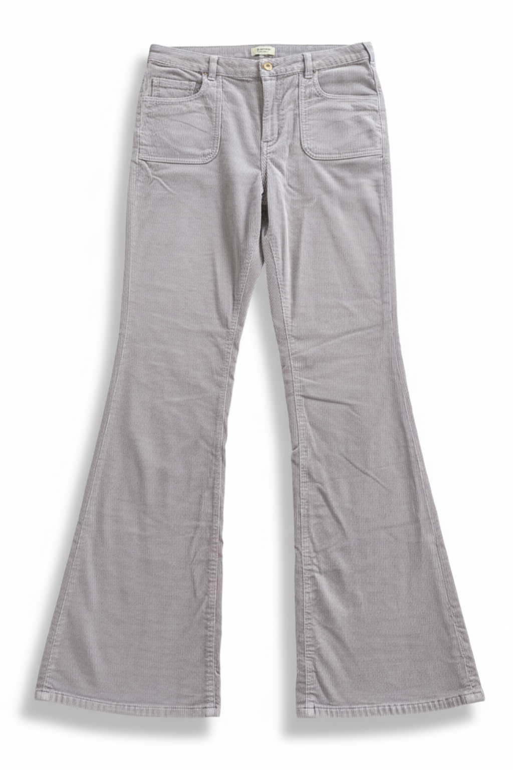 Crafted from soft corduroy, these grey flared pants combine comfort with a modern edge. The high-waist fit offers a flattering shape, while the flared leg adds stylish movement. With ribbed texture and neat tailoring, they are designed for durability and all-day wear. Easy to pair with blouses, knits, or casual tops for versatile outfits.