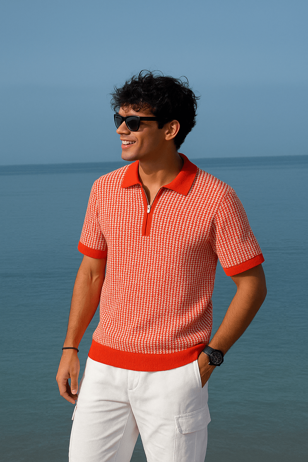 This red and white textured knit half-zip polo delivers a vibrant, eye-catching look perfect for sunny days. Crafted from breathable fabric, it offers both comfort and standout style.